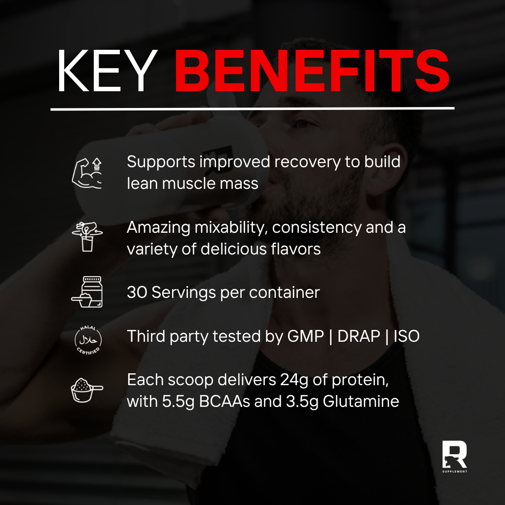 Each scoop delivers 24g of high-quality protein, with added 5.5g BCAAs and 3.5g Glutamine to fuel muscle growth and support faster recovery. It’s the perfect choice post-workout or anytime your body needs sustained protein support.